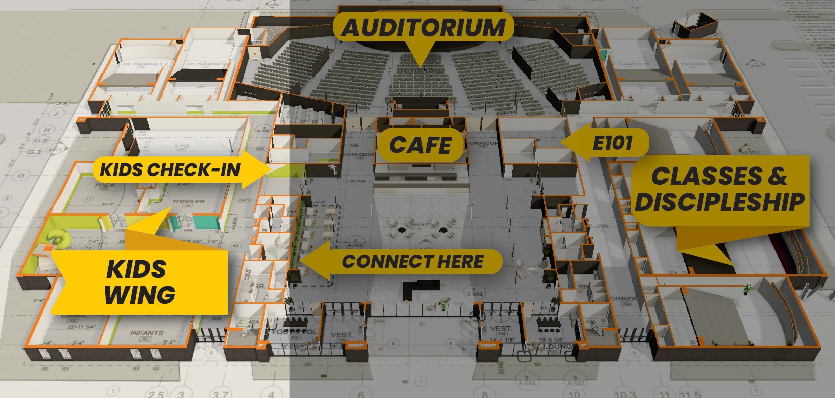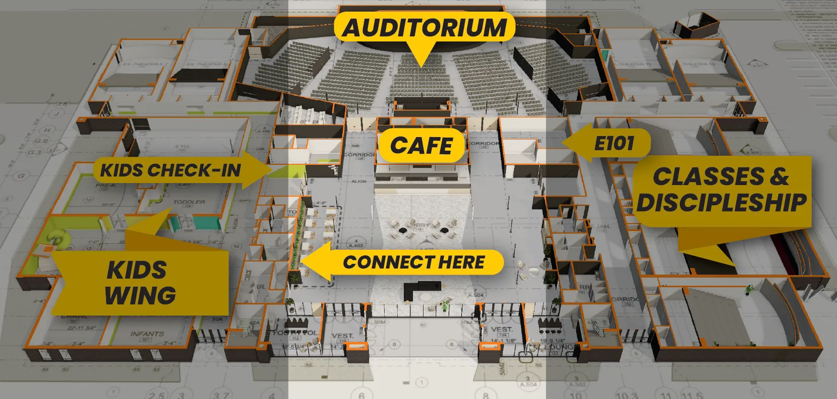 When you enter Eternity Church the lobby features the Cafe, Connection Hub, and Kid's Check-In. The auditorium can be accessed through the main doors, straight ahead on either side of the cafe.